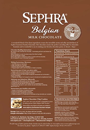 Sephra pure Belgian Milk couverture chocolate contains 38.5% of cocoa. This is our original specially formulated couverture chocolate developed for use by commercial chocolate fountain operators and for home use chocolate fountains. Made from all natural ingredients and kosher certified, it contains no hydrogenated oils or substituted vegetable fats. Sephra Belgian Chocolate is the highest quality chocolate for use in chocolate fountains. Sephra's chocolate fountain chocolate is packaged in 2 lb. bags convenient for portion control and for better product shelf life. Also use Sephra Belgian Chocolate for the best chocolate chip cookies you have ever tasted! Imported from Belgium Special chocolate fountain recipe No extra ingredients needed, Fountain Ready 38.5% Cocoa Solids Contains two (2) 2lb bagsFeature