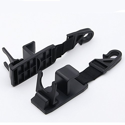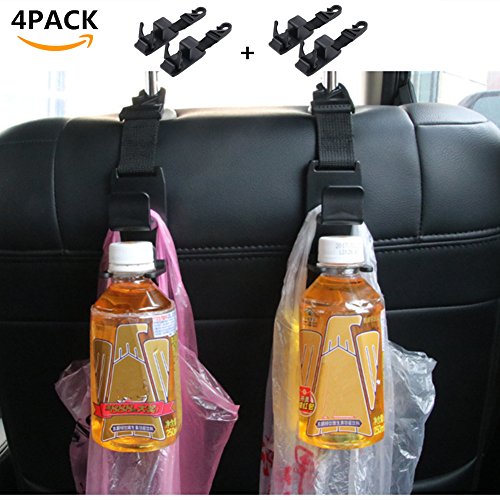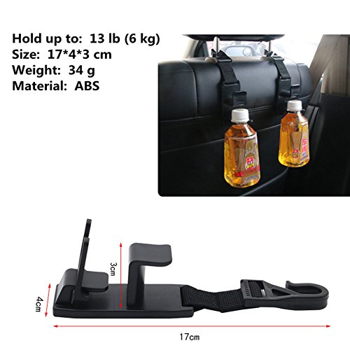 - STRONG AND DURABLE - The Seat Headrest Hangers Comes in a 4 PACK and is constructed out of premium quality material that each can hold up to 13 lb (6 kg), The Hooks will definitely organize your back seat clutter and will give you Seat, Floor and Leg room. It also includes a BONUS bottle holder part for each hook to add on the bottom hook to turn it into a bottle holder