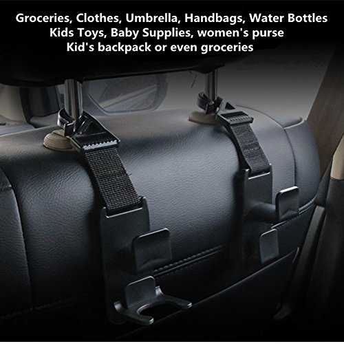 - FUNCTIONAL USAGE - Groceries, Clothes, Umbrella, Handbags, Water Bottles, Kids Toys, Baby Supplies, women's purse, kid's backpack or even groceries, which require careful treatment, but you don't want to put them in the trunk or keep in hands - all these you can hang up on our car bag holder. Our Hanger fits almost every Car, SUV, Van, Truck, headrest