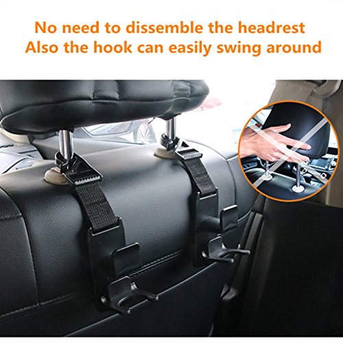 - EASY INSTALLATION - Backseat Headrest Hook installs easy with the side opening design so you will not need to dissemble the headrest, Also the hook can easily swing around so it can be used for the front or back of the seat. It’s also easy to remove when not in need or changing to another car