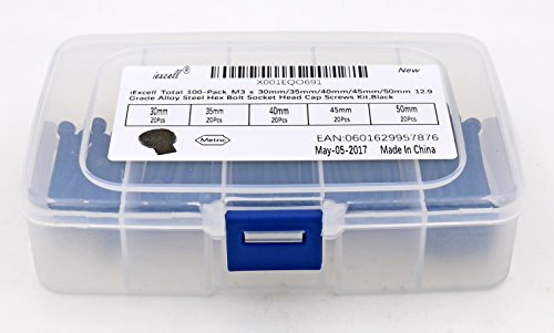 iExcell Total 100-Pack M3 x 30mm/35mm/40mm/45mm/50mm 12.9 Grade Alloy Steel Hex Bolt Socket Head Cap Screws Kit,Black