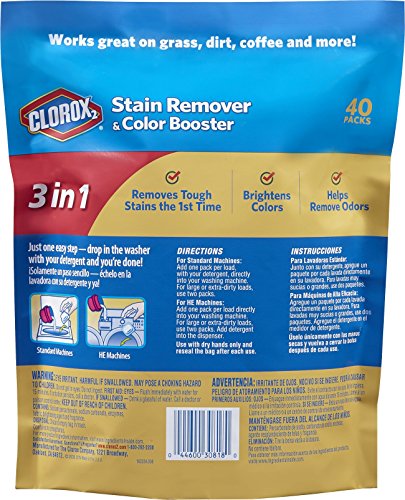 Studio : Clorox 2 Publisher : Clorox 2 Binding : Health and Beauty Product Description Clorox 2 Stain Remover and Color Booster Packs helps keep clothes looking newer, longer. The 3 in 1 packs brighten colors, help remove odors and tough stains the first time. They are easy to use, just add one Clorox 2 Stain Remover and Color Booster pack along with detergent into standard or high efficiency washing machines and you are done. Keep clothes looking their best longer with Clorox 2 Laundry Stain Remover and Color Booster packs. 0