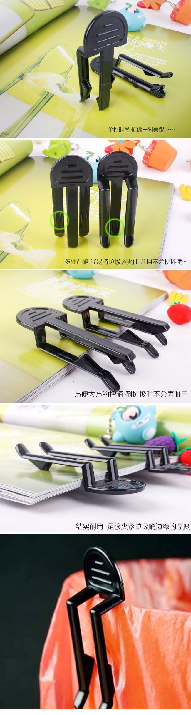 垃圾袋套入垃圾桶后,2个夹子轻轻一夹,再也不用担心垃圾袋下滑脱落了。