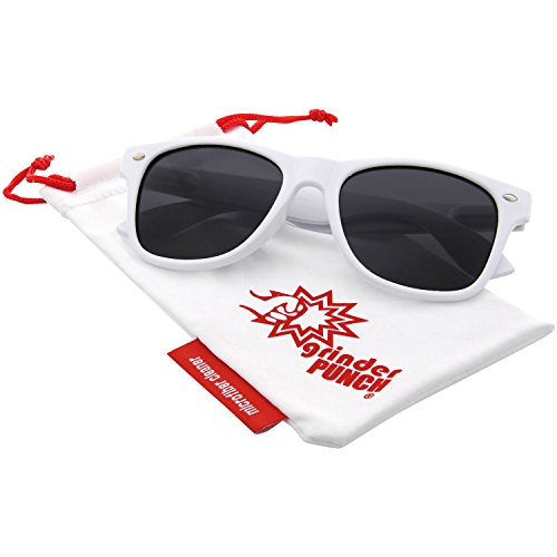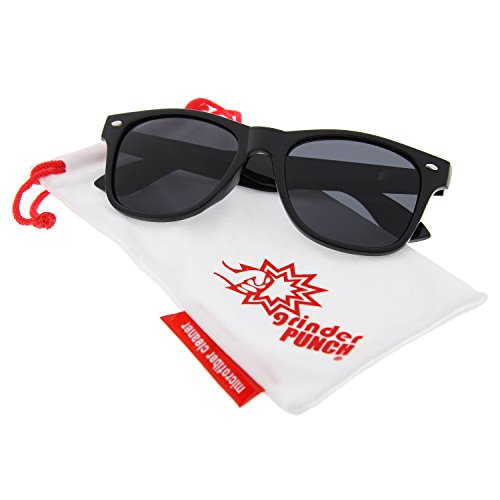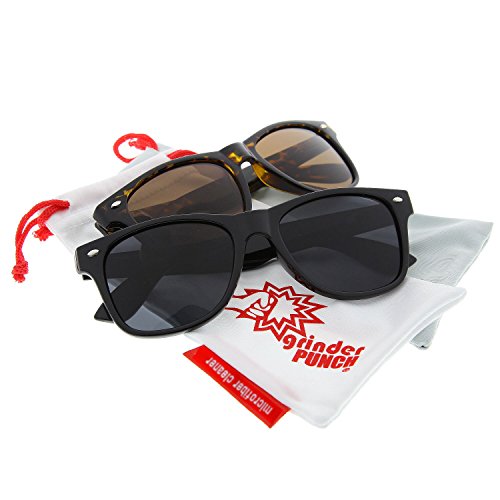 Product Description grinderPUNCH® Polarized Wayfarer Inspired Classic Sunglasses - Polarized Sunglasses are great for many uses! Great for driving, great for fishing, and anywhere glare is an issue. - UV400 Protection Lens and Spring Hinge Arms for Comfort. - Adult Size: 5.7 inches wide (end to end) / 2.4 inches tall (top to bottom including frame) - Includes: - Polarized pair of grinderPUNCH® Sunglasses - grinderPUNCH® Microfiber Cleaning Pouch - Note: As with any polarized sunglasses, looking at LCD screens, or computer / phones, you will see a little rainbow-ing due to the inherent nature of how polarization works. 0