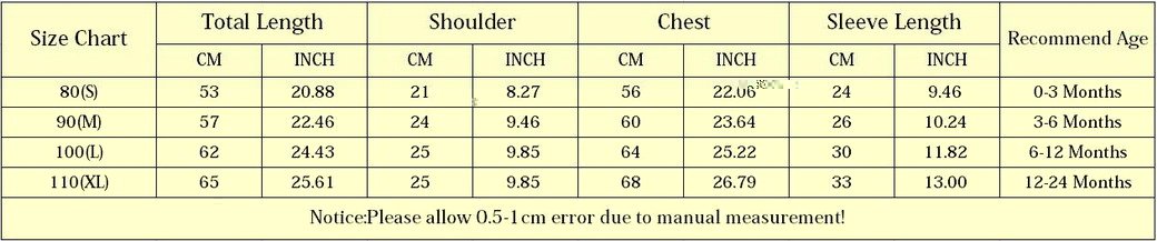 Size S: Length: 53 cm Shoulder width: 21 cm Chest circumference: 56 cm Sleeve length: 24 cm Recommended age: 0 - 6 M;