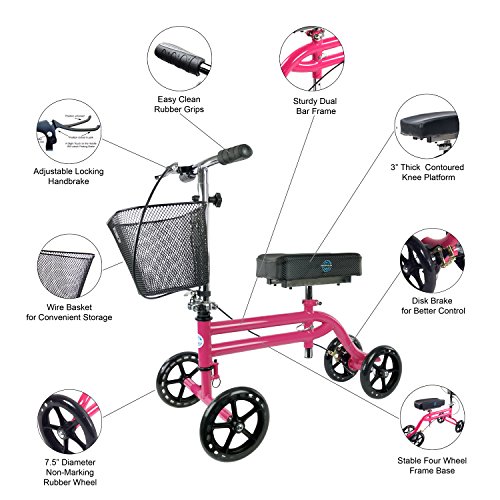Ideal for individuals recovering from injury or surgery to the foot, ankle or lower leg as well as below the knee amputees. The PINK Knee Scooter is one of the most proven and trusted knee walkers in the industry and an excellent crutch alternative.
