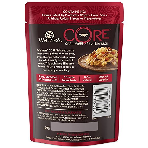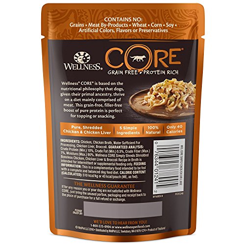 -. Title : Wellness CORE Simply Shreds Grain Free Dog Tasty Topper 3 Flavor 6 Pouch Variety Bundle, 2 each: Chicken Salmon Pumpkin, Chicken Liver Broccoli, Chicken Beef Carrots, 2.8 Ounces