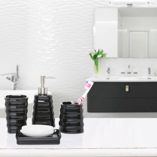 -. Feature : A set of bathroom counter top accessories made of ceramic materials and featuring a chic ribbed design. / Features 1 tumbler, 1 toothbrush container, 1 soap dish, and 1 lotion or liquid soap dispenser. / Perfect for organizing and decorating your bathroom or for giving as a gift for a housewarming or a wedding. / **Official MyGift® product.** / Approximate Dimensions (in inches): Soap Dish - 5.25 W X 0.75 H X 3.75 D; Toothbrush Holder - 3.75 H X 3.25 Diameter; Tumbler - 4.5 H X 3 Diameter; Liquid Soap Dispenser - 7 H X 3.5 Diameter.
