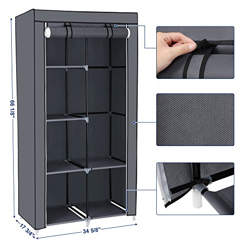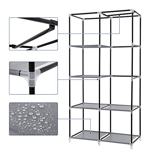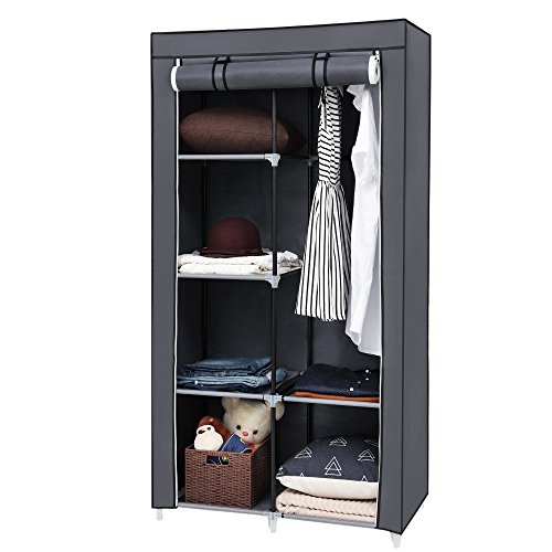 Studio : Songmics Publisher : Songmics Binding : Kitchen Product Description This SONGMICS wardrobe is a practical and quick storage solution for bedroom, guest room or university accommodation. There is space in the bottom for shoes, bags etc. Lightweight frame makes to move around easily. When not in use, this closet organizer can be taken apart in seconds. What a wonderful piece! Specifications: - Color: Gray - Material: Iron, Non-woven Fabric, PP - Assembly Required: Yes - Load Capacity of Each Layer: 8lbs (3.62kg) - Load Capacity of Hanging Rod: 39.7lbs (18kg) - Load Capacity of Whole Product: 83.8lbs (33kg) Package Contents: - 1 x Clothes Wardrobe - 1 x Instructions Note: - Do not leave the product exposed to the sun for an extended period of time which will shorten its service life. Please keep this wardrobe in a cool, dry place to avoid molding. 0