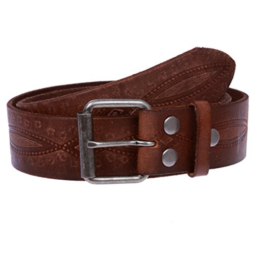 Binding : Apparel Product Description This embossed belt, made of 100% genuine one thickness full grain oil-tanned soft leather, for casual wearing or wear with jeans; This belt comes with roller buckle, snap on, removable, interchangeable. You may want to find different styles of 1 3/4" belt buckles for replacement in our store to create your own unique designs. This belt is specifically designed in a way that make it possible for helping easily interchange your favorite belt buckles without any tools. Only one thing needs to be considered when you are picking up buckles for this belt - the inside width of the buckle or swivel must be at least 1 3/4". This belt size is measured from leather end at buckle to the center hole at tip end. Order at least one size larger than pants size. 0