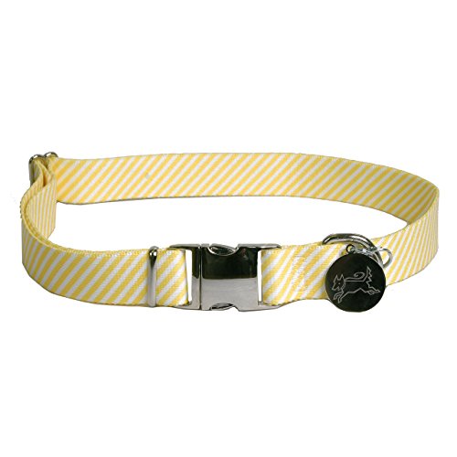 Studio : Yellow Dog Design Publisher : Yellow Dog Design Binding : Misc. Product Description This is the Southern Dawg Seersucker Yellow Premium Dog Collar with Tag-A-Long ID Tag System - Size Medium - 3/4 inch wide and fits neck sizes 14 to 20 inches from Yellow Dog Design, made right here in the USA. Keep your dog in the latest fashion with this stylish, functional and durable dog collar. TAG-A-LONG - This brand new, patent pending Pet ID Tag system is built right in to this dog collar. The Tag-A-Long system makes it easy to swap out ID tags from one collar to another, or to change ID Tags on the same collar. Perfect for when a special tag is needed at the dog park, on the beach, or as a service dog. We've included this special feature at no cost! EASY ON EASY OFF - Using a quick release clasp, the collar can easily be taken on or off the dog. Don't worry though, opposable thumbs are necessary to activate the quick release. SIZING: This dog collar utilizes a quick clasp closure, also called a side release clasp. Sizing is given as a range of neck lengths. Measure your dogs neck size or its current collar length (not including buckles) to obtain correct sizing. If you are shopping for designer, affordable dog/pet collars, then look no further. These durable, guaranteed to last dog collars have no rough edges, no threads to fray or break, no problem going in the wash, and no stress getting them on or off your dogs. 0