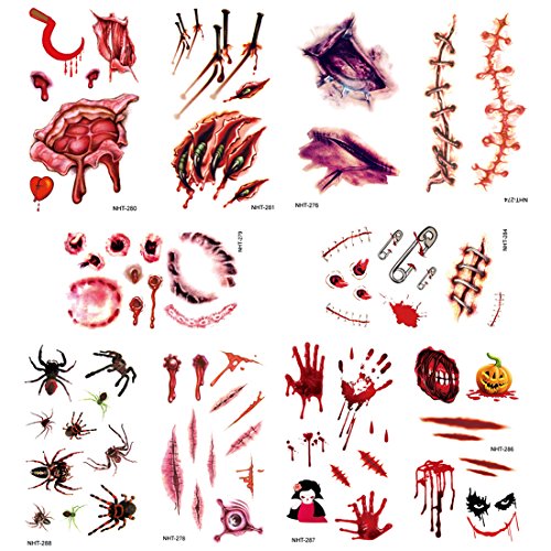 -. Title : Halloween Tattoos Sticker – JACHAM 10 Sheets Waterproof Fake Bleeding Wound Temporary Tattoos for Party, Cosplay and Prank.