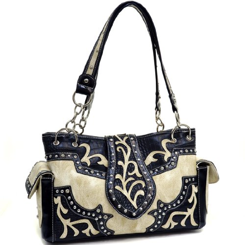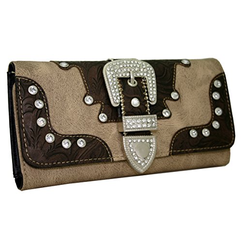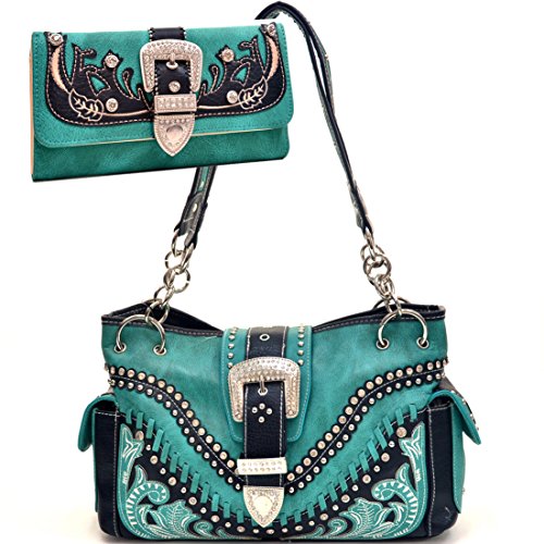-. Brand : Way2Culture -. Department : womens -. Feature : Made of high quality faux leather. Rhinestones belt buckle accent on front. Beautiful embroidered floral trim. / Vintage floral lined interior. Interior features a back wall zip pocket & front wall multifunctional pockets. Center zippered divider compartment. Exterior feature 1 back zippered concealed handgun pocket. Two sides pouch pockets with magnetic snap closure / Top zipper closure. Dual shoulder strap with 12.5'' drop length. Approx. Size: L14''x H8.5''x 5'' / Wallet: Made of high quality faux leather. Trifold wallet secured by magnetic snap. Embroidered rhinestone buckle accent. 2 transparent ID window. 10 credit card slots. / Wallet Approx Size: L7.5''x H4.5''x W1'' -. ProductGroup : Shoes -. ProductTypeName : HANDBAG -. Title : Western Purse Rhinestone Buckle Accent Handbag & Matching Wallet Set
