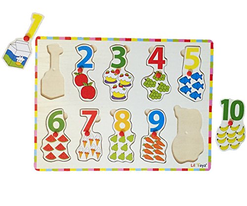 -. Binding : Toy -. Brand : Lil Toyz -. EAN : 0860260000260 -. Feature : Learn to count number 1-10 peg puzzle / Pictures shows delicious snack items corresponding to each / Lightweight and sturdy wooden construction / Dimensions: 11.75" x 8.75" x .25" -. IsAdultProduct : 0 -. Label : Lil Toyz -. Manufacturer : Lil Toyz -. ProductGroup : Toy -. ProductTypeName : TOYS_AND_GAMES -. Publisher : Lil Toyz -. Studio : Lil Toyz -. Title : Lil Toyz Counting Number 1-10 Peg Puzzle -. UPC : 860260000260