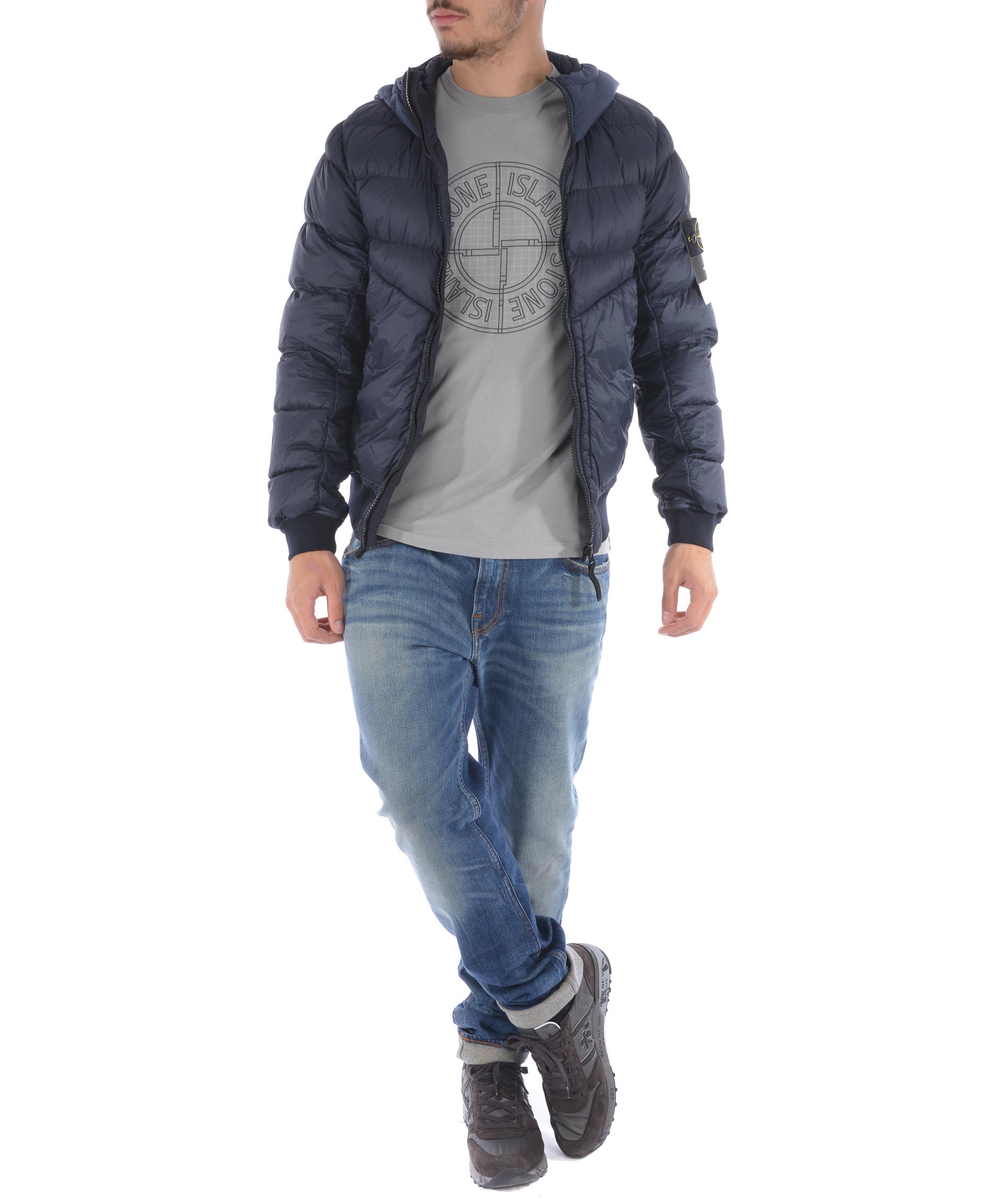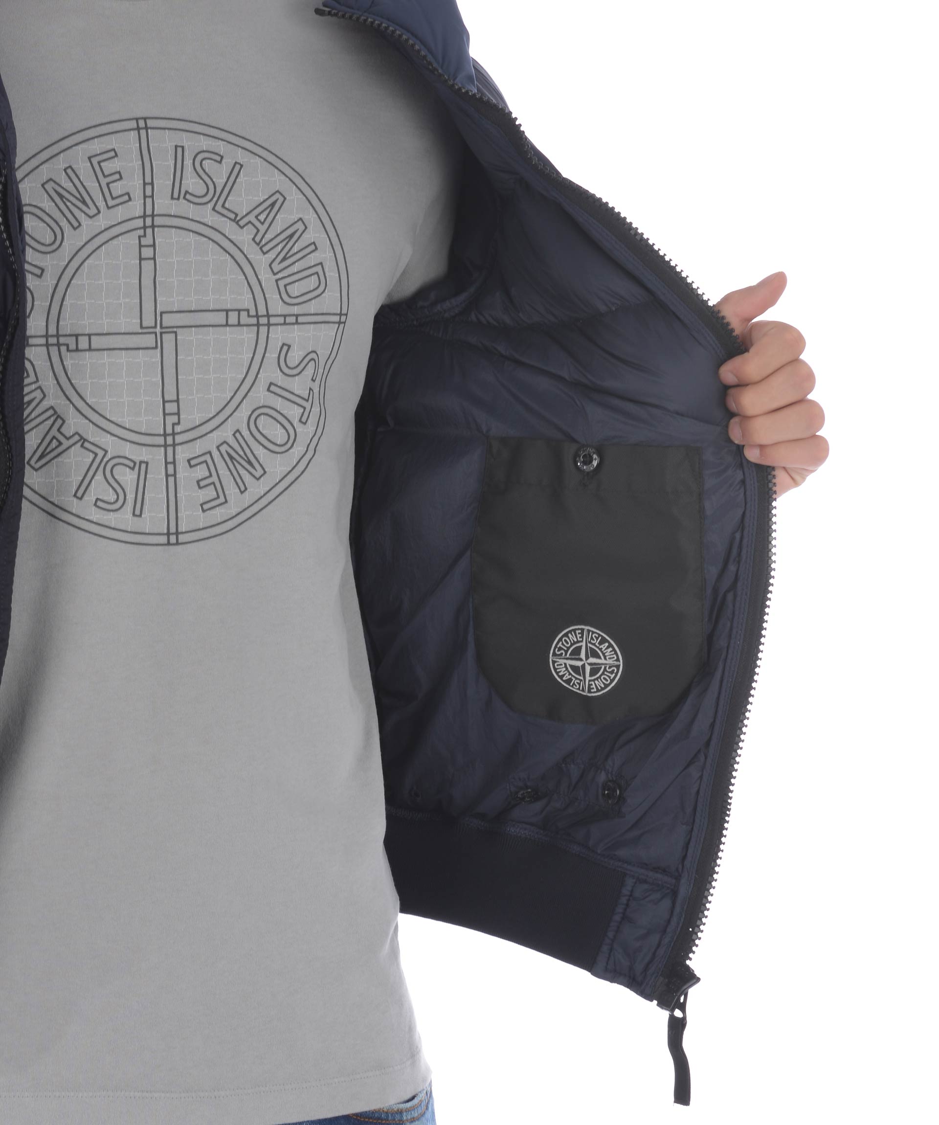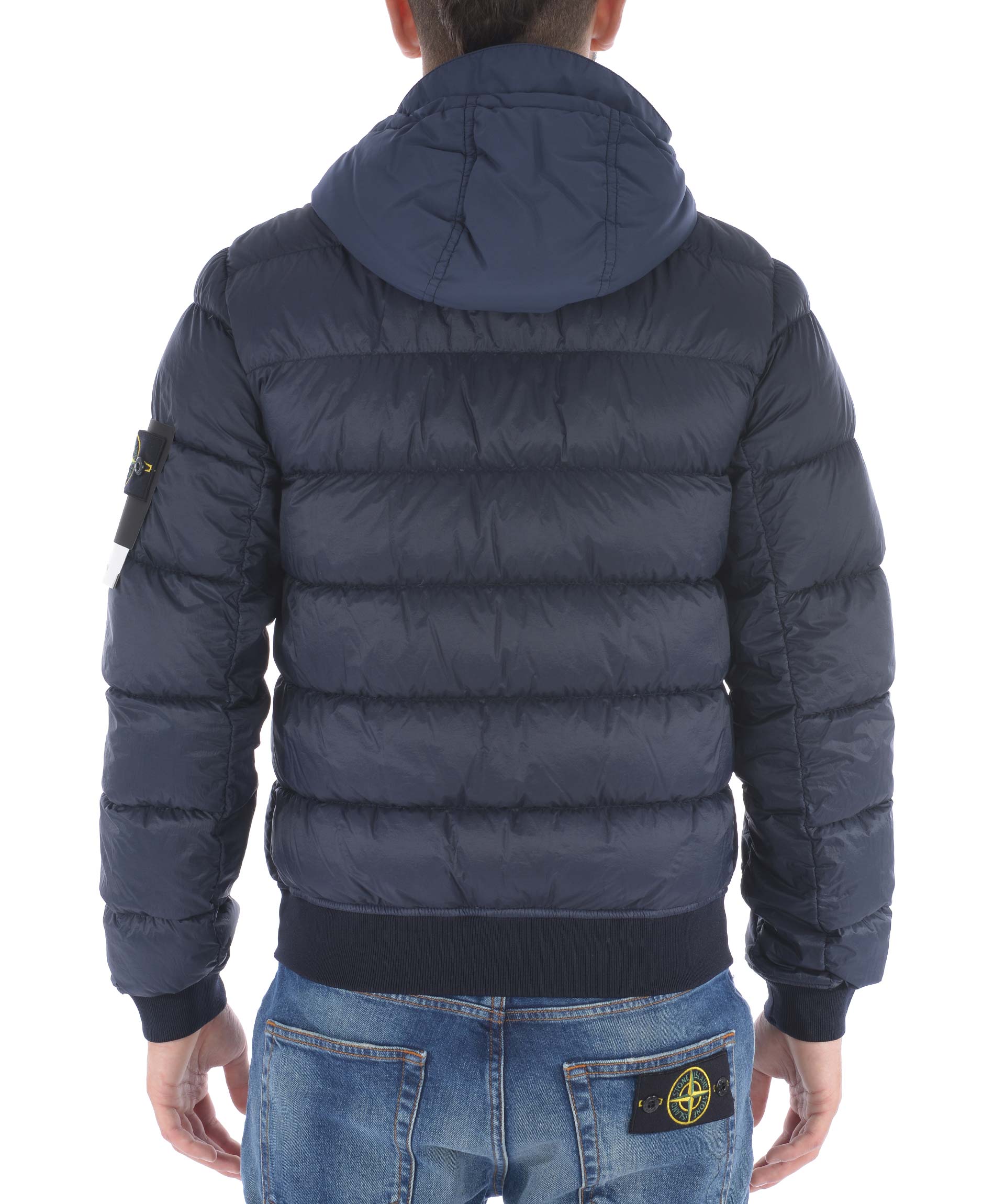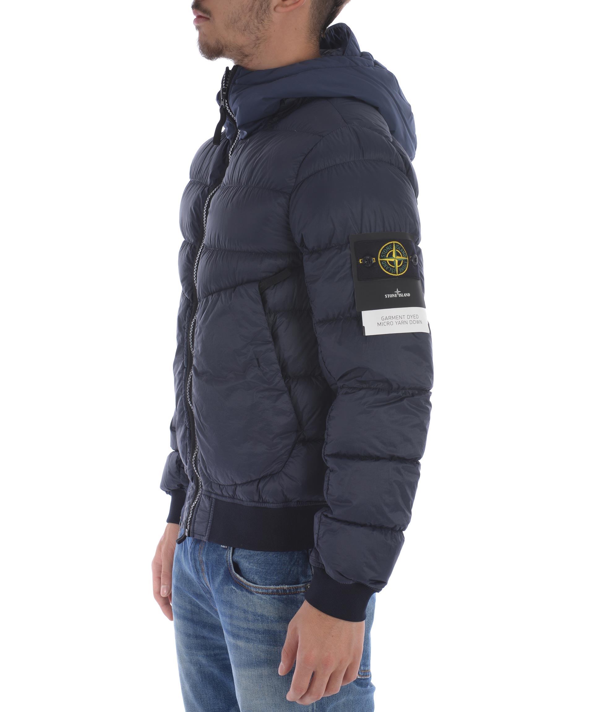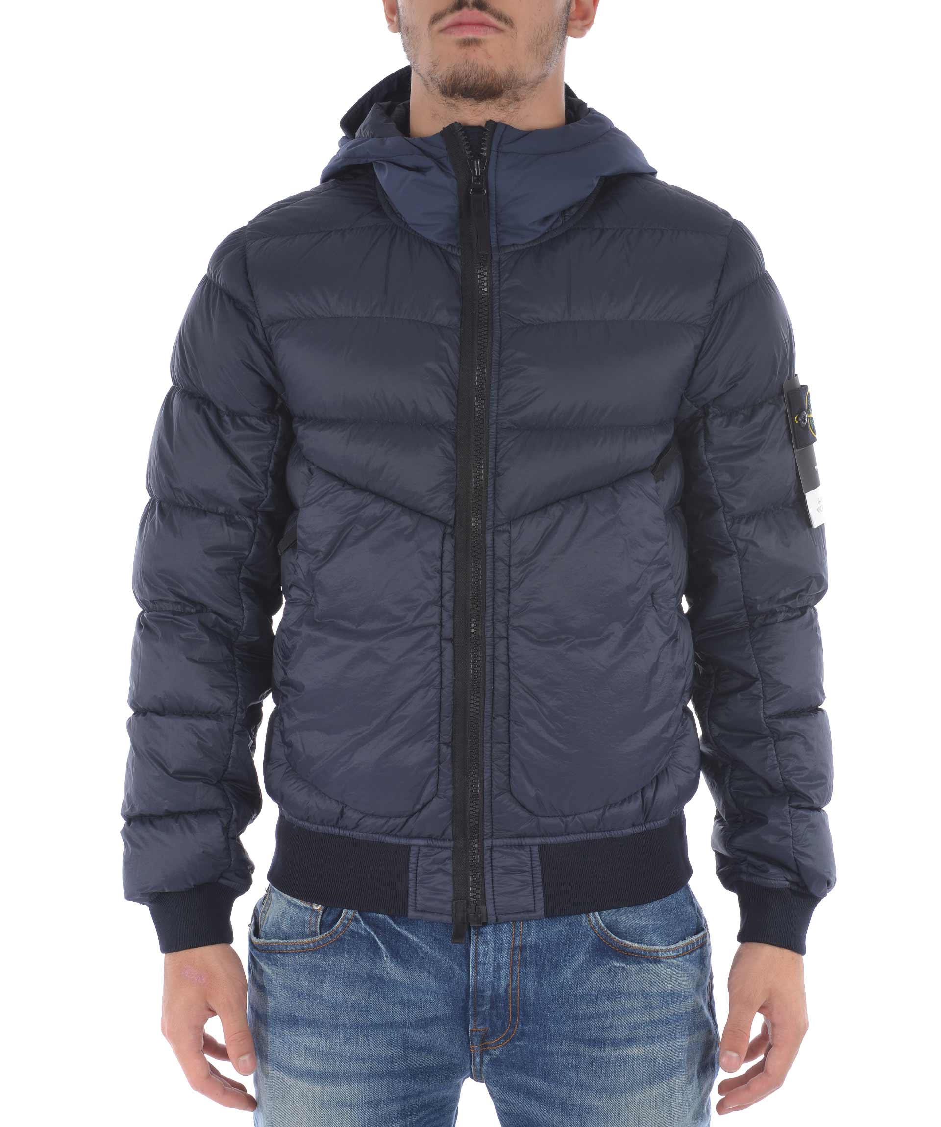 Piumino Stone Island in nylon trapuntato ultra leggero Blu scuro. Imbottito con piuma d'anatra. Cappuccio con visiera. Chiusura frontale con zip. Tasche frontali con zip. Elastico a costine sui polsini e al fondo. Taschino interno con bottone. Patch logo in lana removibile sulla manica sinistra.