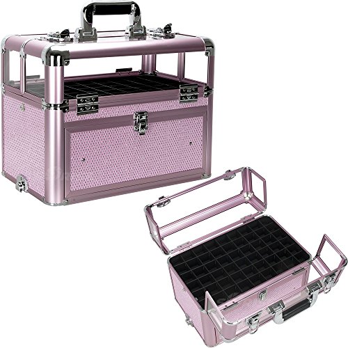 -. Binding : Misc. -. Brand : SunRise -. EAN : 4913213196254 -. Feature : High quality aluminum finish and construction for extra durability / Beautiful new pink krystal pattern finish with pink aluminum trimming / Removable liquid foundation holders on top case with clear panel for easy view (up to 54 bottles) / Heavy duty handle for added comfort and grip;Easy to clean interior / Overall case dimensions (LxWxH): 14.5" x 9.5" x 11" -. IsAdultProduct : 0 -. Label : Sunrise -. Manufacturer : Sunrise -. MPN : E3310KLPK -. PartNumber : E3310KLPK -. ProductGroup : Beauty -. ProductTypeName : BEAUTY -. Publisher : Sunrise -. Studio : Sunrise -. Title : SUNRISE Nail Case Polish Organizer E3310 Professional, 54 Bottle Capacity, Clear View Acrylic Top with Shoulder Strap, Pink Krystal