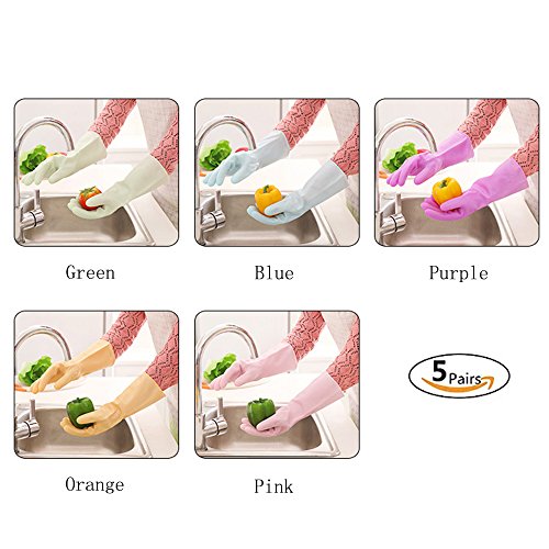 Set of 5 Pairs, Reusable Waterproof Latex Household Gloves for Kitchen Dish Washing Laundry Cleaning, Medium (5 Colors)