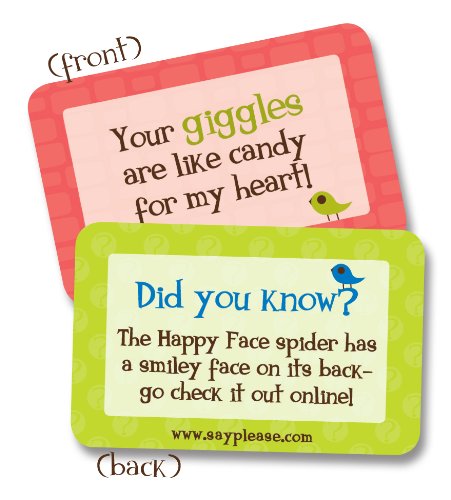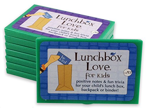 Lunchbox Love® - positive notes and fun trivia or jokes for your child's lunchbox, backpack, binder, or pillow. Busy parents and caregivers will love this easy yet meaningful way to share positive feelings and values with their children. Fun trivia on the back entertains. Positive words on the front enlighten. Each volume contains 12 cards--10 with different phrases and fun facts or jokes and 2 blank fronts so you can add a personal message. Credit-card size plastic case fits easily into a pocket, purse or on a countertop, making it easy to grab and give.