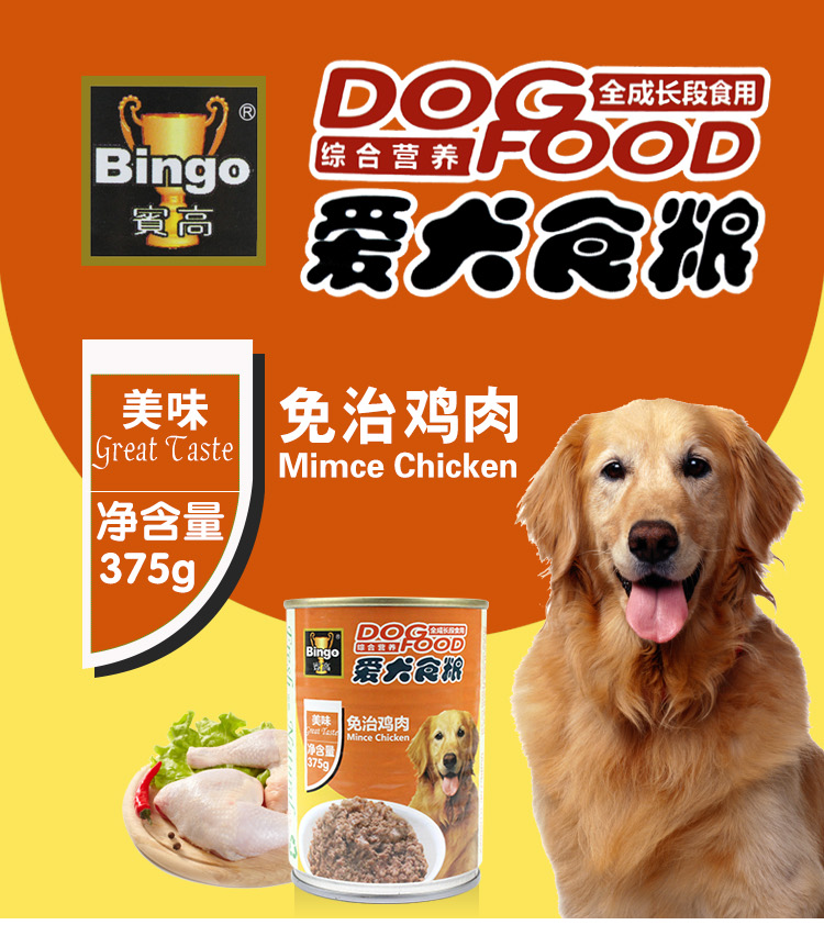 Bingo canned dog series products, cereals contain a large number of high-quality carbohydrates, can not only provide dog activities needed to heat sources, and the protection of their internal organs of health. Bingo canned dog series products, minerals and vitamins, cellulose content and reasonable. Minerals can promote dog loves cats The new supersedes the old., anti blood coagulation; vitamin is dog loves cats remain indispensable nutrients health, plays an important role in regulating physiological function,strengthen the nervous system, blood vessels, muscles and other system functions, components involved in enzyme system; cellulose little nutritional value, but for the dog loves cat but, have important physiological significance, help in vivo intestinal peristalsis, reduce the incidence ofdiarrhea and constipation.