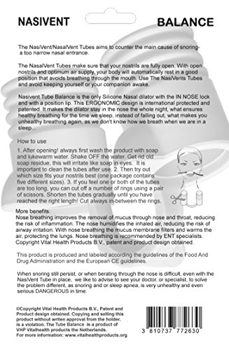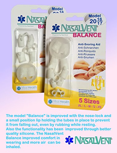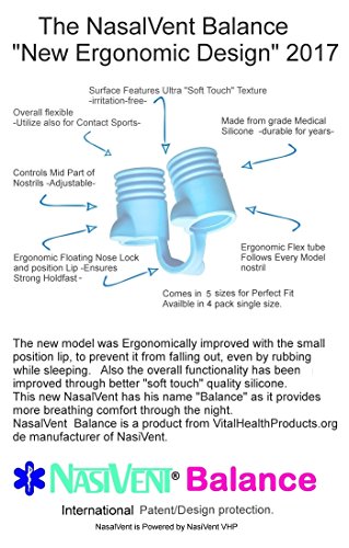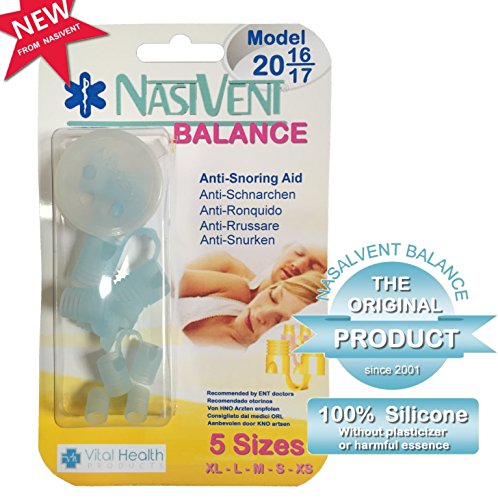 -. Binding : Health and Beauty -. Brand : VHP-NasiVent -. Color : Blue / soft -. EAN : 3810737772630 -. Feature : Nasivent Balance New model 2016-17 (Soft blue ) Promo sale / 100% Comfort due to NEW Medical Ergonomic Design, with floating Nose Lock including position lip. / Does not slip out, to secure your Healthy Breathing the whole night through. / The NasiVent Balance Starter pack has 5 sizes, including X-Small for children to avoiding early mouth breathing. / The new NasiVent Balance is not noticeable when wearing. (Money back warranty) -. IsAdultProduct : 0 -. Label : VHP -. LegalDisclaimer : Not suitable for children under the age of 5. -. Manufacturer : VHP -. MPN : Balance-starterpack -. PackageQuantity : 1 -. PartNumber : Balance-starterpack -. ProductGroup : Health and Beauty -. ProductTypeName : HEALTH_PERSONAL_CARE -. Publisher : VHP -. Size : 5x -. Studio : VHP -. Title : Snoring aids "This latest model Stays PUT" NasiVent Balance 2016-17 "NEW MODEL"