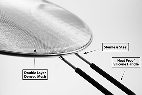 DOUBLE LAYERED - Our splatter screen is designed with DOUBLE layered woven mesh to prevent oil splashes, made out of stainless steel with built in SILICONE stay-cool handle for safety holding.