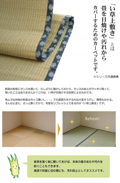 上敷きを敷くだけで畳のお部屋をリフレッシュ出来ます。日焼けしてしまった畳のリフレッシュに、新品の畳を汚さないためのカバーにご使用下さい。