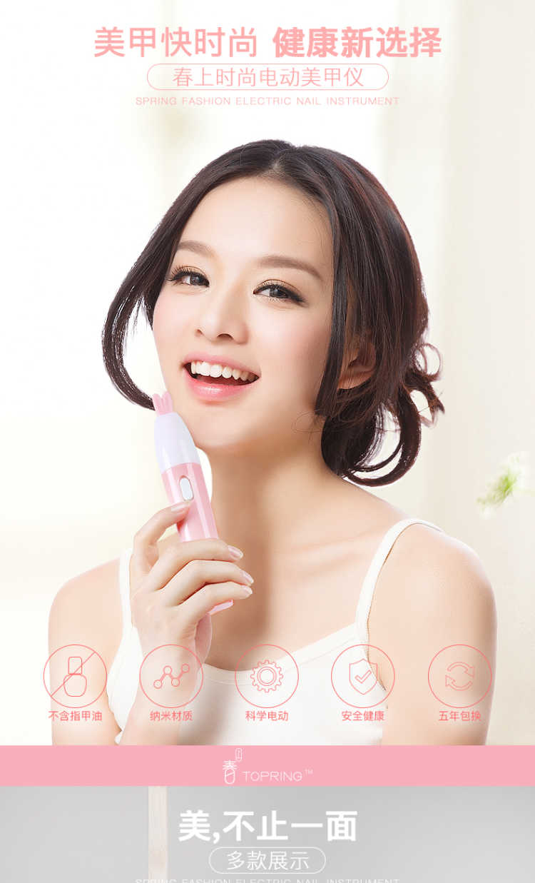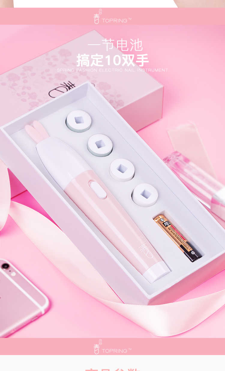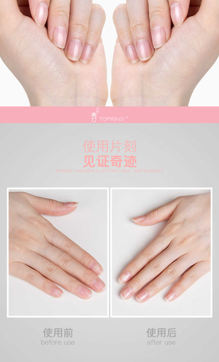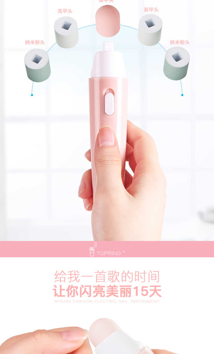【买一得七】主机+磨砂打磨头+纳米粉头*2+抛光头*2+电池 春上电动美甲仪是一款新型美甲神器,通过打磨指甲表面使指甲如同做了美甲一样好看,纯物理打磨,对人体没有任何伤害,对指甲也没有任何磨损! 【功能介绍】 用春上美甲仪给指甲轻轻打磨抛光 几分钟就能让这指甲平滑光泽 就像拥有了一位私人美甲师 机器小巧玲珑携带方便,随时随地给你美甲,如同包包里的美甲店 操作简单易懂 跟涂甲油相比,美甲仪的操作简单的不能再简单了 【使用方法】: 第一步先使用磨砂打磨头给指甲修型, 第二步使用绿色打磨头打磨指甲表面, 第三步使用白色抛光头给指甲表面抛光! 非常简单!使用效果非常好!