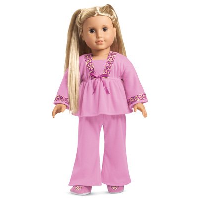 The first night in Mom's new apartment, Julie misses her bunny, Nutmeg. But dressed in her comfy pink PJ's, Julie does her best to adjust and rest easy. Put her to bed in this outfit that features: An empire-waist tunic with bell sleeves, butterfly trim, and a satin bow in front Elastic waist pants with slightly flared legs A pair of cozy pink velour slippers with a butterfly embroidered on each toe