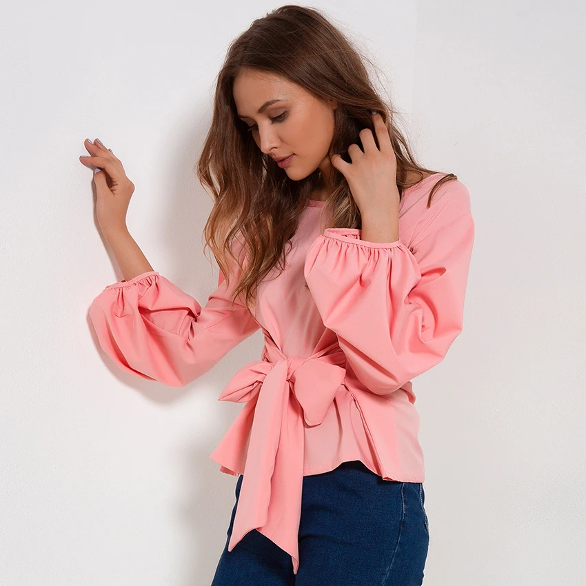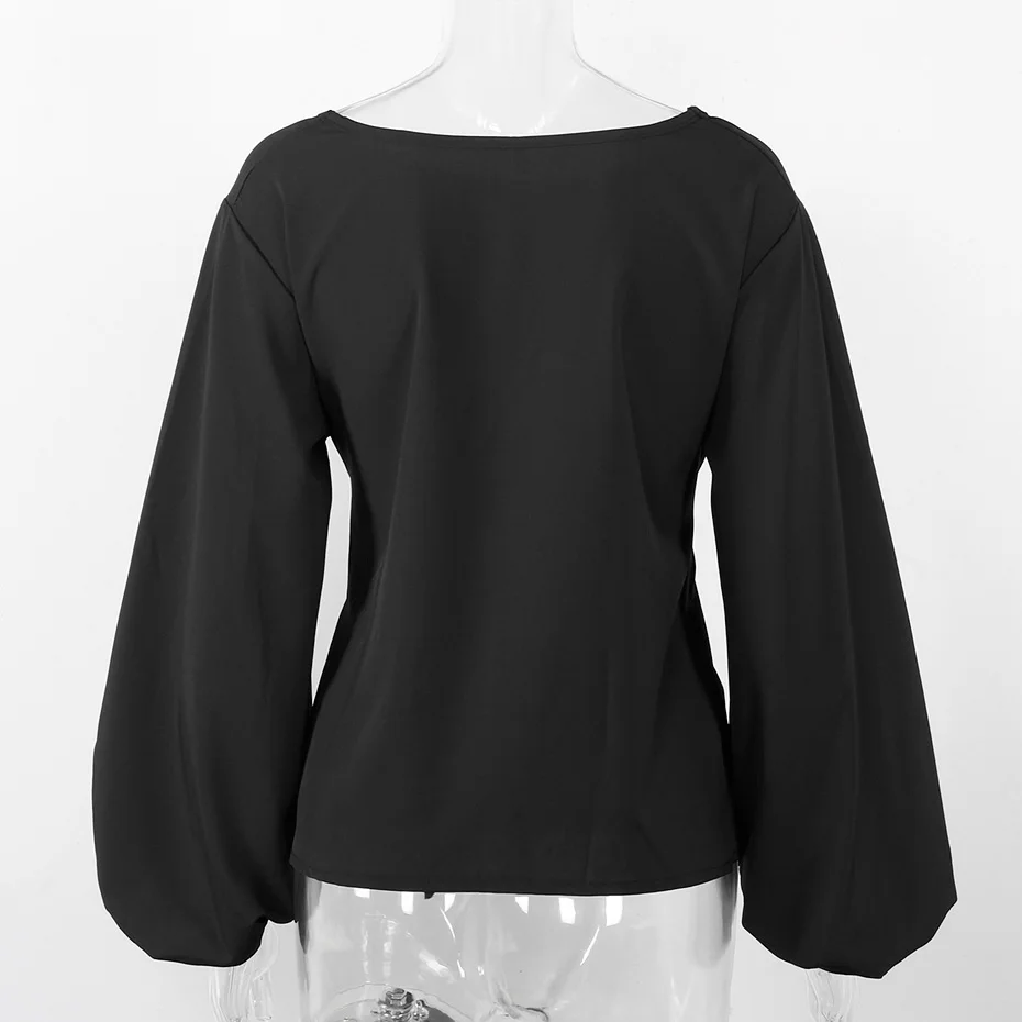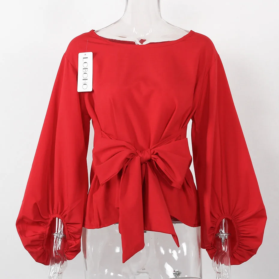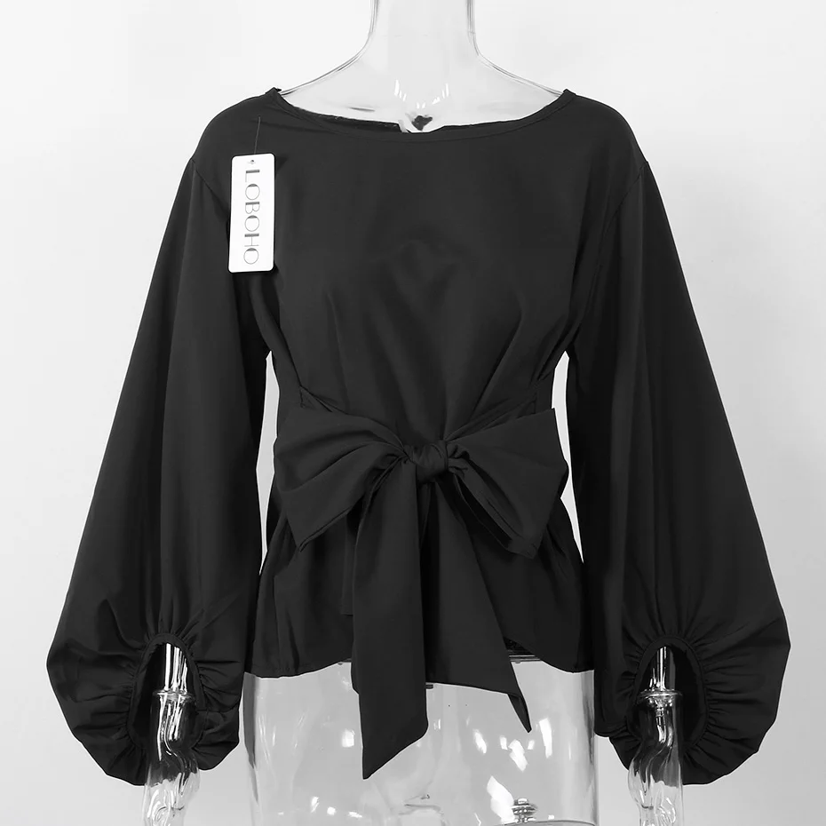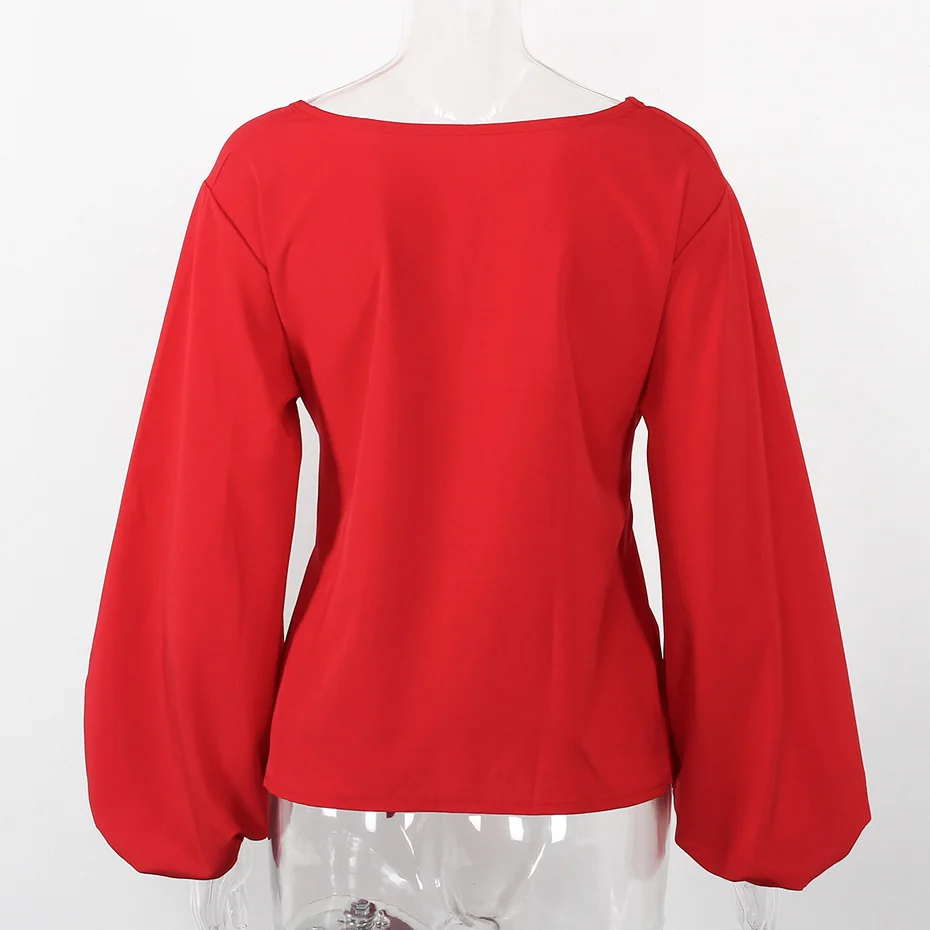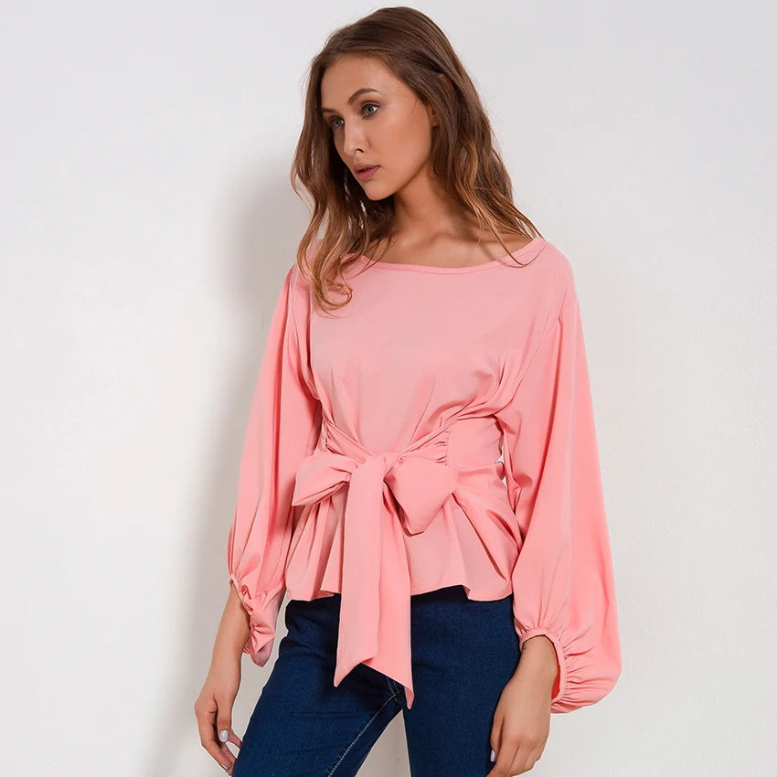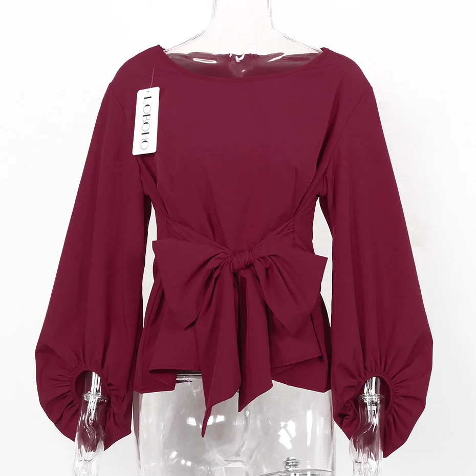 Feature :Lantern Sleeve Loose Chiffon Wrap Blouse With Bow Belt