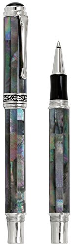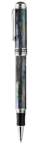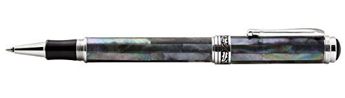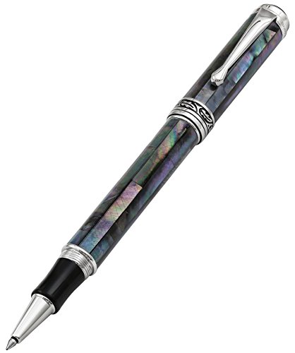Solid brass barrel and cap with inlay of natural iridescent black Mother-of-Pearl; Supplied with gift box, (1) extra Xezo roller pen refill, certificate and 3-year warranty card
