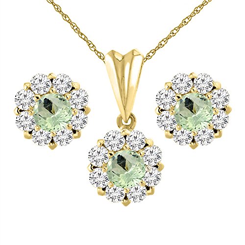 -. Title : 14K Yellow Gold Natural Green Amethyst Earrings and Pendant Set with Diamond Halo Round 6 mm
