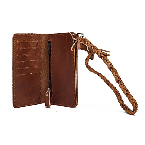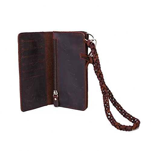 -. Feature : GENUIEN LEATHER: Premium cowhide leather makes this wallet looks very luxurious and durable,Vintage and unique design looked a lot different to most of the wallets / This leather wallet Comes with a removable handmade leather strap, keeps everything secured. / More & Large Capablity: 6 card slots,1 zipper pocket,1 interior pocket (fits cell phone), 2 bill slots, can be used for a cash/photo/coin/credit card/cell phone holder. / Easy Cleaning: Spot cleaning & Surface cleaning recommended, DO NOT keep it close to fire or Soak into water long time! / Dimension: 7.1 x1x3.7 inches (18 x 2.5 x 9.5 cm),Fits well into pants pocket.
