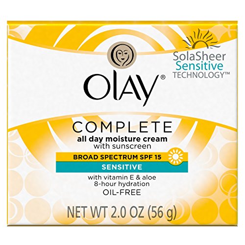 Caring for sensitive skin is simple if you have the right moisturizer. Olay complete all day moisture cream with sunscreen for sensitive skin helps you maintain a healthy, beautiful-looking appearance. This gentle, rich and creamy formula gives your skin 12 hours of long-lasting hydration. Plus, it contains broad spectrum SPF sunscreen to provide protection from the sun's harmful rays. Your skin will even love its gentle, 100% oil-free, fragrance-free and PABA-free formula. Designed for sensitive skin by Olay skin experts to help prevent premature aging, Olay complete all day moisture cream with sunscreen for sensitive skin conditions your skins surface with vitamin e and aloe, and provides 12 hours of moisturization. The formula is also non-comedogenic, which means it won't clog your pores. All this and such a luxurious, velvety feeling too.to Keep your sensitive skin looking and feeling fresh and healthy, use Olay complete all day moisture cream with sunscreen for sensitive skin every day. And when youre planning to be out and about, just apply it liberally 15 minutes before sun exposure and reapply every 2 hours if you remain outdoors. Its that easy.Feature