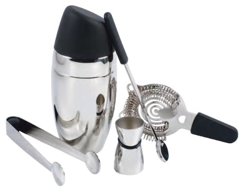 Italian design. Soft grip features.Contains 18 oz. cocktail shaker set, cocktail strainer, double jigger ( 1oz., 1/2 oz) Ice tongs, bar spoon.