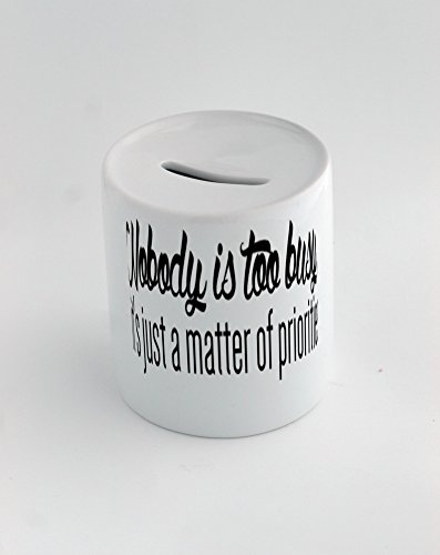 Product DescriptionMoney box with Nobody is too busy, it's just a matter of priorities0