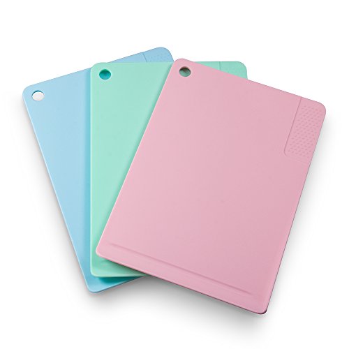 SAFE & HEALTHY: The BPA-free chopping boards are certified tested to provide you with the safest surface for food preparation. Withstand up to 1250C. Pleasing colors with food icons to prevent cross-contamination and food poisoning.