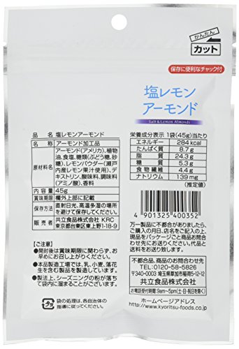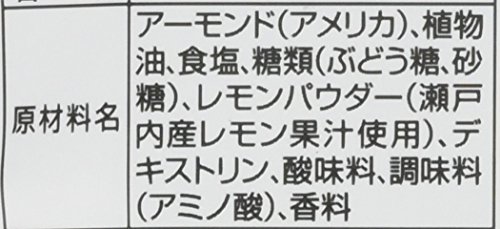 原材料:アーモンド(アメリカ)、植物油、食塩、糖類(ぶどう糖、砂糖)、レモンパウダー(瀬戸内産レモン果汁使用)、デキストリン、酸味料、調味料(アミノ酸)、香料