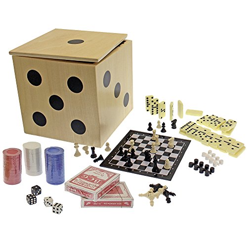 Classic pastimes tucked inside the pinewood cube include chess, checkers, dominoes, dice, poker chips, 2 decks of cards, and backgammon!