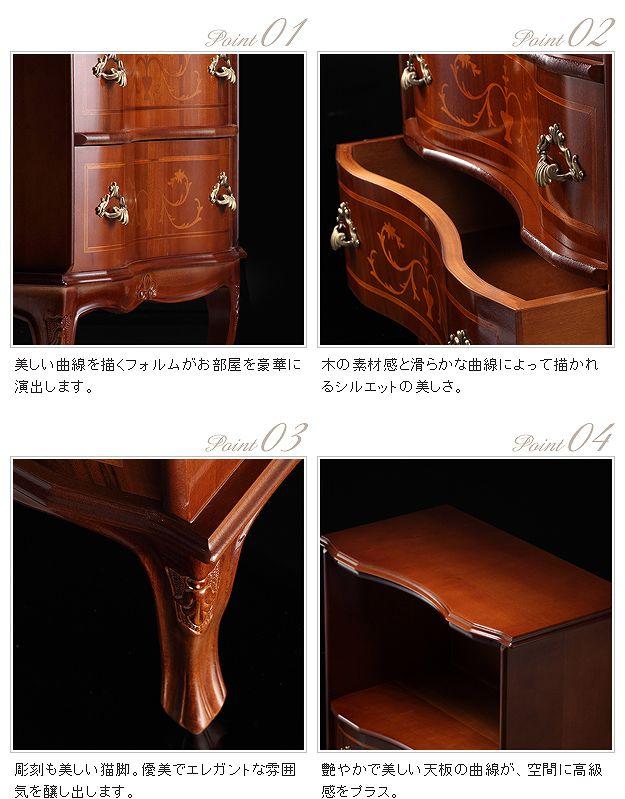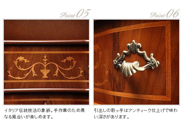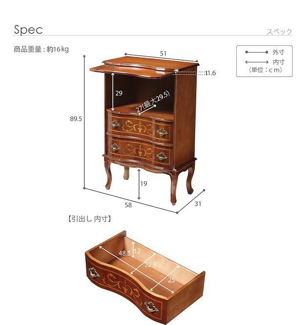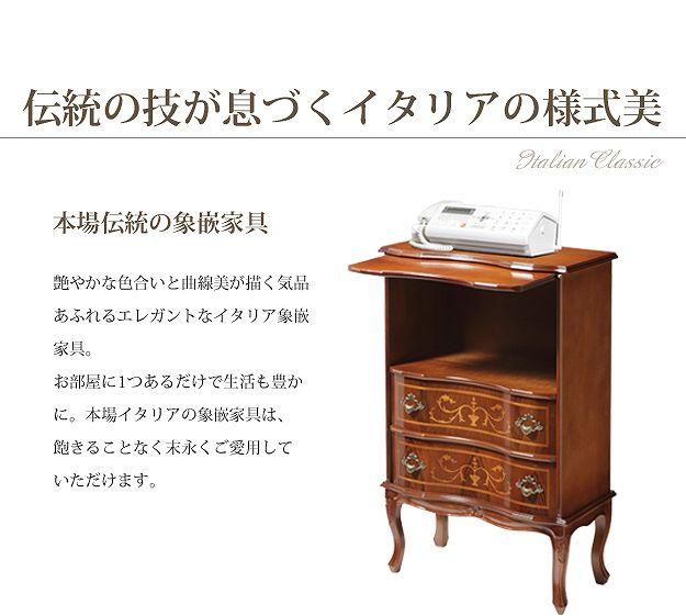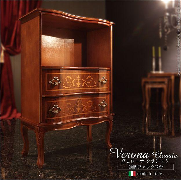 商品について:芸術作品ともいえるイタリア直輸入家具をご自宅に☆ヴェローナクラシック猫脚ファックス台。艶やかな色合いと、滑らかな曲線を描くフォルムがお部屋をエレガントに演出します。彫刻が美しい猫脚も魅力的。引き出しの前板にはイタリア伝統の職人技である象嵌細工が施されています。