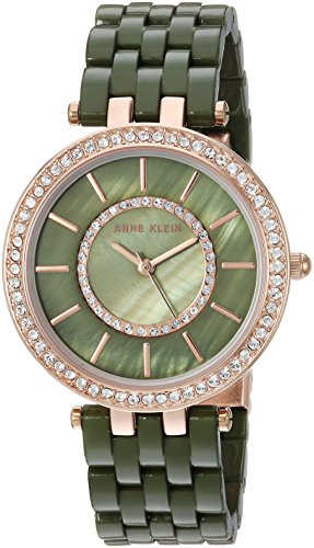 Bezel set with 60 clear Swarovski crystals; mineral crystal lens; olive green mother-of-pearl dial with rose gold-tone hands and markers; center ring accented with 35 clear Swarovski crystals