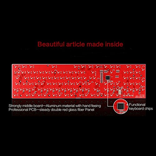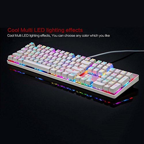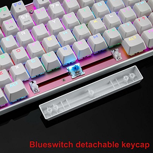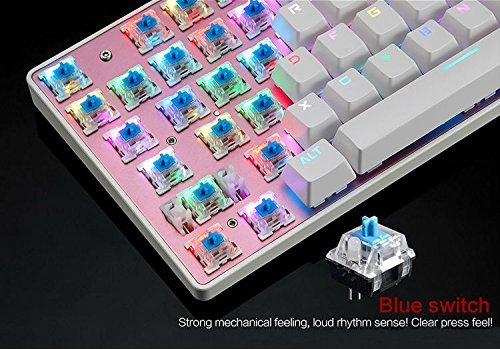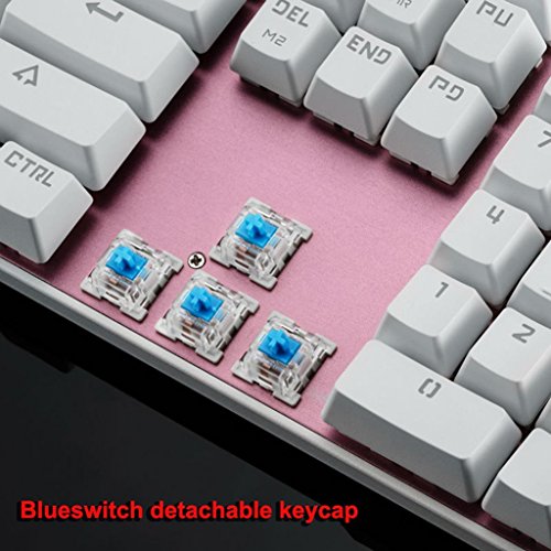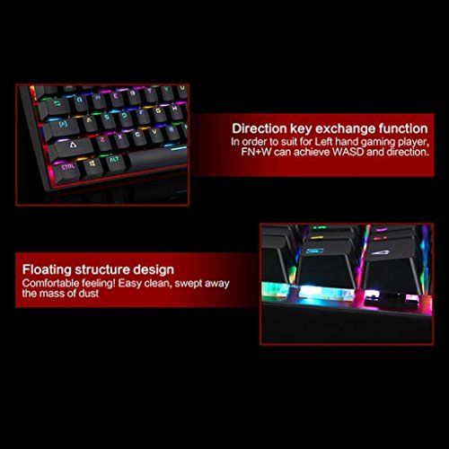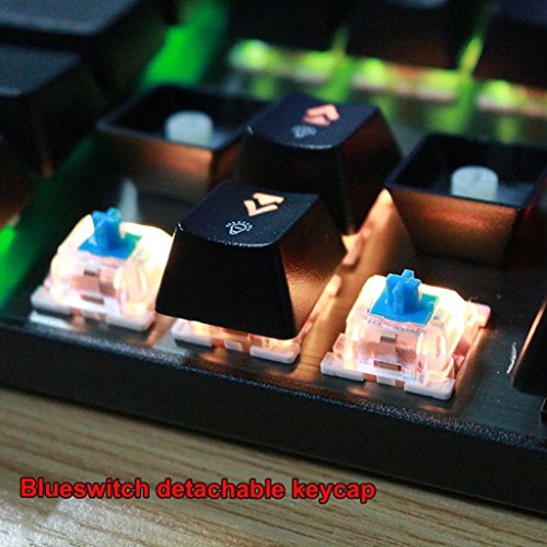 -. Feature : Blue switches(Outemu), light key pressure with resistance and bounce, clicky feedback, excellent keystroke feeling. / Unique suspended keys design, unique keystroke rhythm feeling.Anti ghosting with full keys unlimited simultaneous keystrokes. / Colorful backlit with 10 LED modes.Keycaps with unique bicolor mold injection for durable. / Ergonomically designed to fit your fingers and wrists, which can effectively reduce the fatigue caused by intensive long hours gaming. / 11 easy-access multimedia shortcut keys and Fn+F12 combination keys for WIN key quicklock.