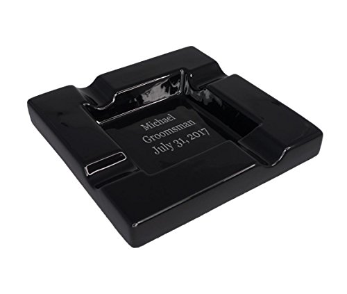 -. Feature : Laser Engraving Done in Georgia Font; Three Lines of Text up to 15 Characters / Glossy Black Ceramic; Great for Indoors or Outdoors / Features 4 Cigar Rests and Large Basin / Approx. Dimensions: (L) 7.5 in x (W) 7.5 in x (H) 1.4 in / Foam Padded Bottom to Protect Furniture; Easily Clean with Wet Cloth