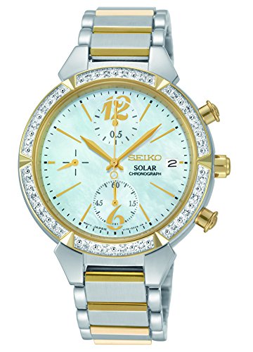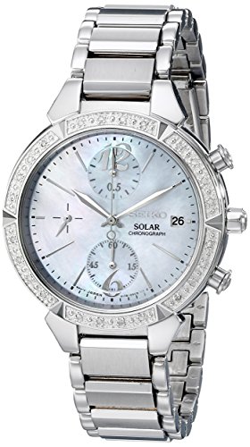 Solar-powered watch featuring diamond-encrusted bezel and round mother-of-pearl dial with date window and three subdials