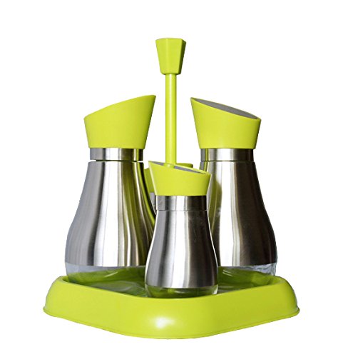 -. Feature : Made of the toughened glass, 18/10 stainless steel, plastic with silicone. Safe to use. / Modern stylish, pouring spout makes dispensing easy and keeps spills to a minimal, you can rotate 180° to hide the spout inside for dust-proof and insect-proof after use. Detachable bottles easy to open and clean. / Including a salt bottle, pepper bottle,oil bottle,vinegar bottle and stand / Approximate Dimensions: Oil Bottle -- 3.4" L X 6.9" H (8.5 cm L X 17.5 cm H). Volume: 14oz (400ml). Salt bottle Capacity:125ML