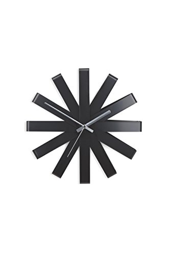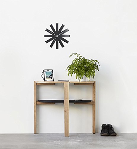 Black powder-coated steel ribbons mark the hours of this modern wall clock