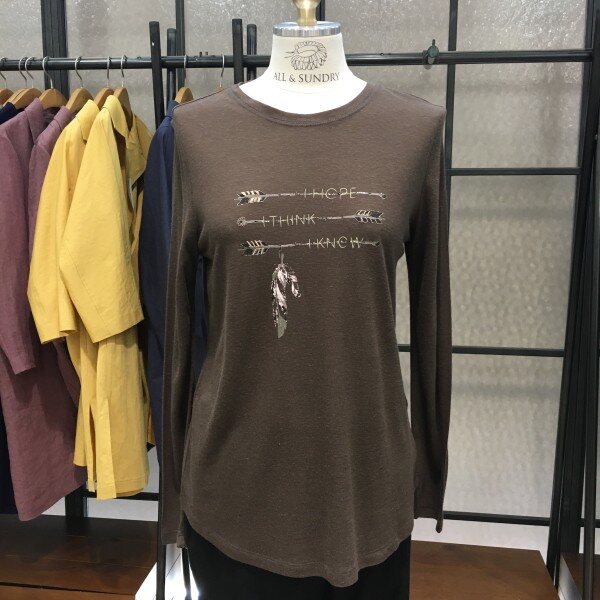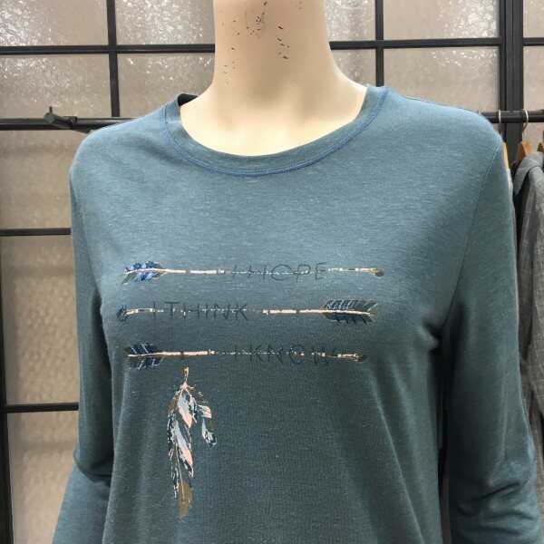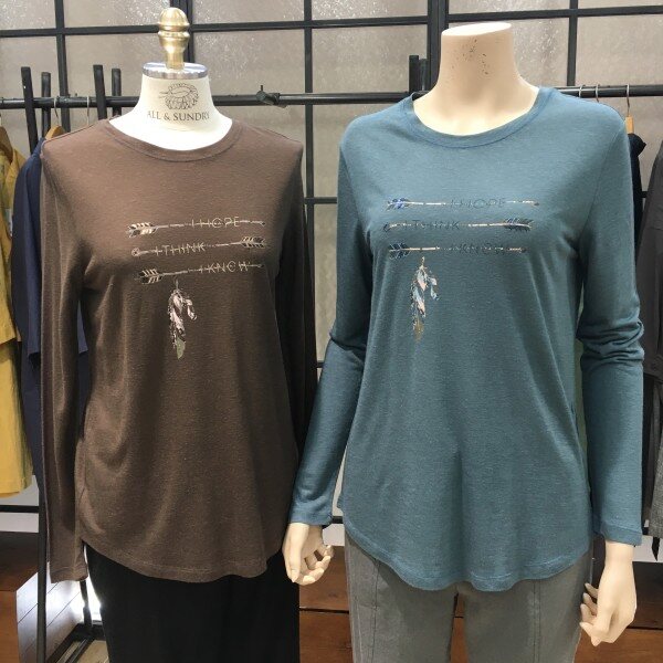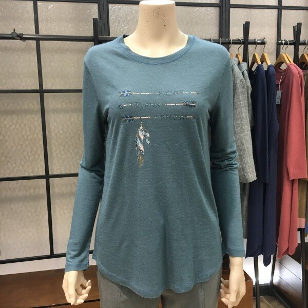 편안하게 즐기기 좋은 긴팔 티셔츠 소개 해드려요:) 프론트에 깔끔한 프린팅 포인트를 주어 감각적이었던 긴팔 티셔츠인데요! 톤 다운된 브라운과 피콕 블루 컬러감이 너무 예뻐 무드 있게 착용할 수 있어요^^! 단독으로도 예쁘고 이너 아이템으로 활용해도 예쁜 매력적인 아이템이라 어디에든 잘 어울려 손이 자주 가실 거예요~ 레이온과 마혼방 소재로 피부 접촉에 불편함 없으셔요^^ 단독으로도 거슬림 없이 입으시구 신축성이 좋게 나온 아이라 활동성도 엄청 편해요! 총장길이는 55사이즈 기준으로 66.5cm입니다.