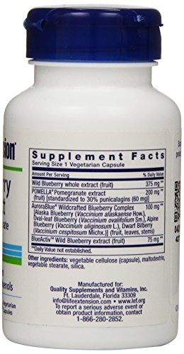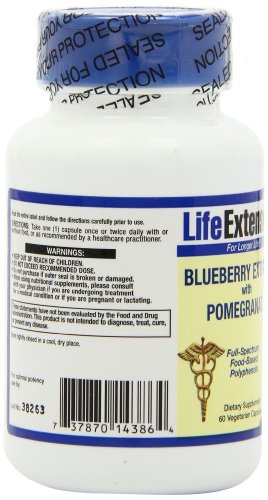 -. Binding : Health and Beauty -. Brand : Life Extension -. EAN : 0737870143864 -. Feature : Contains wild Alaskan blueberries, which possess nearly 10 times the antioxidant capacity of cultivated berries / Blueberries can improve memory and restore healthy neuronal function to aged brains / The two most active constituents found in blueberries are anthocyanins and pterostilbene -. IsAdultProduct : 0 -. IsAutographed : 0 -. IsMemorabilia : 0 -. Label : Life Extension -. LegalDisclaimer : These statements have not been evaluated by the FDA. These products are not intended to diagnose, treat, cure, or prevent any disease. -. Manufacturer : Life Extension -. Model : 737870143864 -. MPN : 737870143864 -. NumberOfItems : 1 -. PackageQuantity : 1 -. PartNumber : 737870143864 -. ProductGroup : Health and Beauty -. ProductTypeName : HEALTH_PERSONAL_CARE -. PublicationDate : 2011-01-12 -. Publisher : Life Extension -. Size : 60 -. Studio : Life Extension -. Title : Life Extension Blueberry Extract w/ pomegranate, 60 vegetarian capsules -. UPC : 737870143864