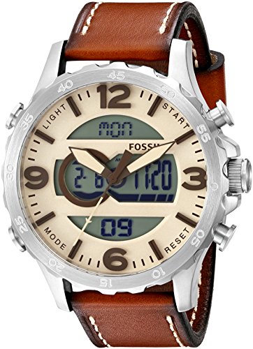 Watch Sizing Guide Maintain your ruggedly handsome look with this stealthy, sleek Fossil® timepiece. Stainless steel case. Stainless steel strap with double push-lock closure. Round face. Three-hand analog and digital display with quartz movement. Beige dial features digital display, matte brown-tone hour markers and hands, Fossil detailing, a minute track, three sub-dials, and a date display window. Chronograph functionality. Water resistant 10 ATM. Imported. Measurements: Case Height: 49 mm Case Width: 49 mm Case Depth: 16 mm Band Width: 24 in Band Circumference/Length: 10 in Weight: 4 oz This product may have a manufacturer's warranty. Please visit the manufacturer's website or contact us at warranty@support.zappos.com for full manufacturer warranty details.Feature