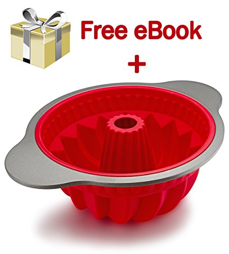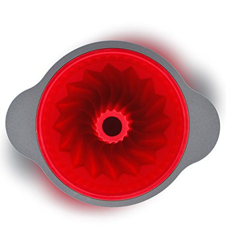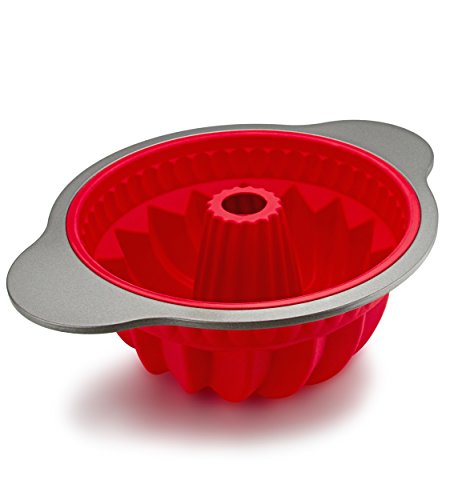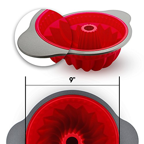 - ✅ PERFECT SIZE BUNDT CAKE - 9” long x 9” wide x 4.6” deep [internal size], red silicone baking dish with high quality steel frame and handles. Turns out perfectly baked bundt or jello cakes with consistent and beautiful results each time!