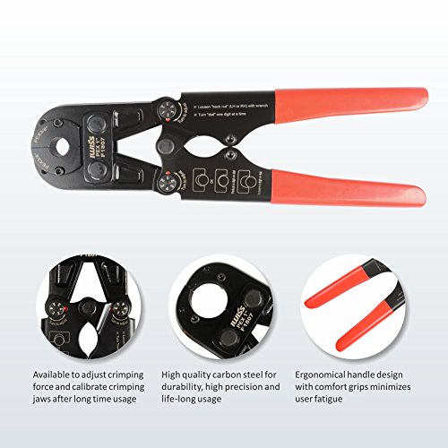 Wrench changes jaws and available adjusts crimping force. Short length and light weight, easy to carry and work in tight space